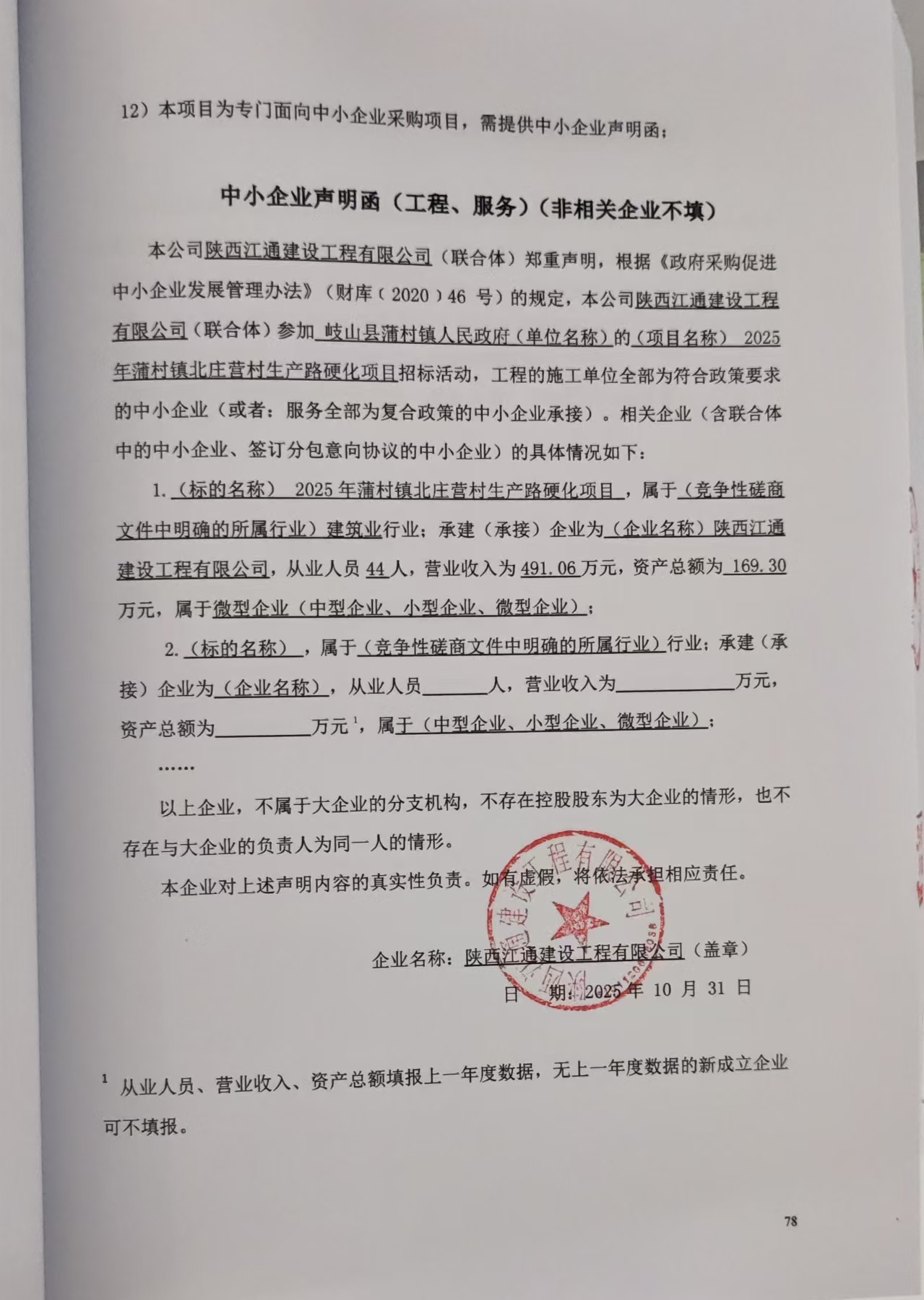 岐山县蒲村镇政府2025年蒲村镇北庄营村生产路硬化项目中标(成交)明细.pdf 竞争性磋商文件-蒲村.pdf 中小企业声明函-江通.jpg