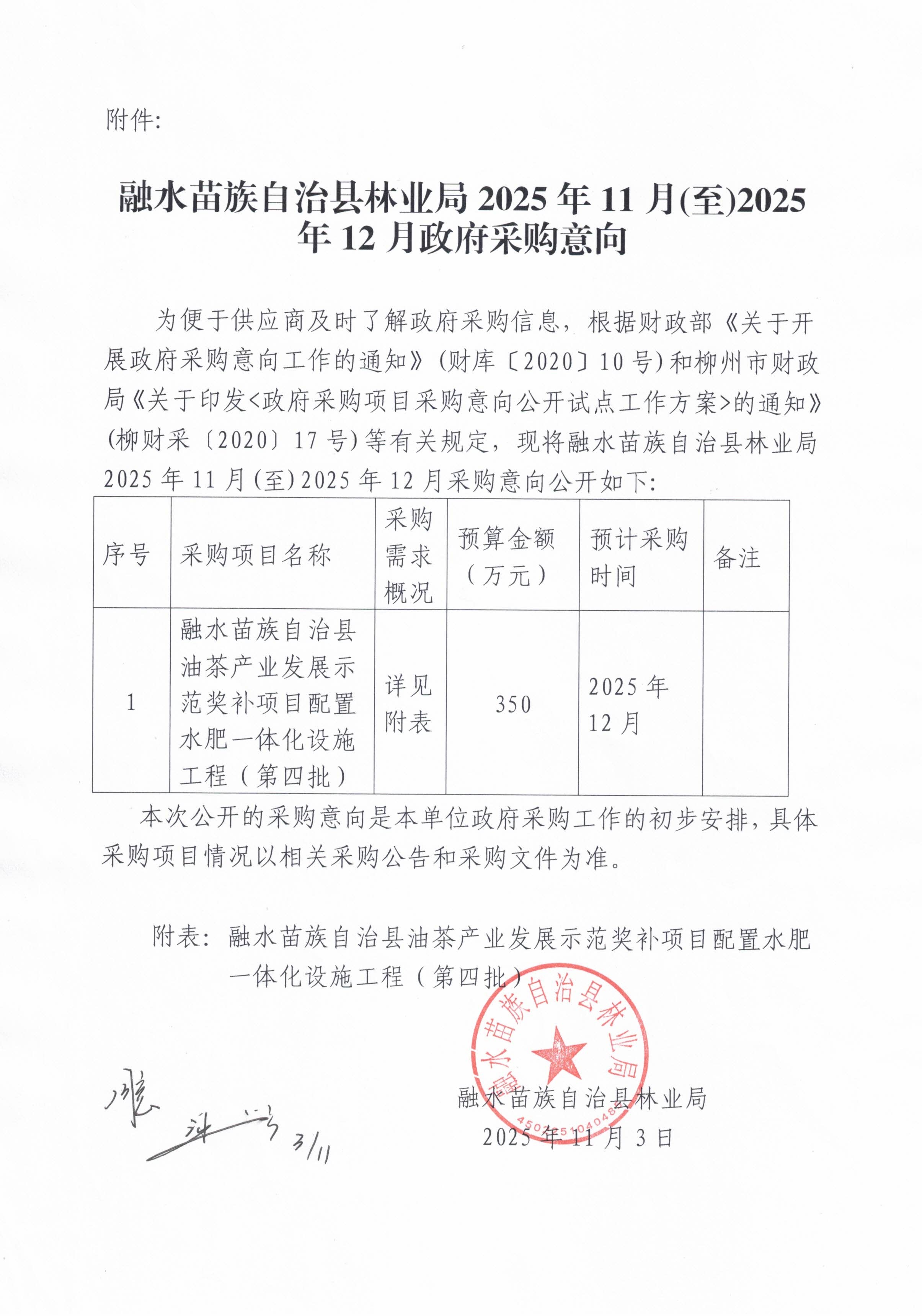 为便于供应商及时了解政府采购信息,根据《财政部关于开展政府采购意向公开工作的通知》(财库〔2020〕10号)和《广西壮族自治区财政厅关于进一步规范政府采购意向公开工作的通知》(桂财采〔2022〕84号)等有关规定,现将******林业局2025年11月至12月采购意向公开如下: