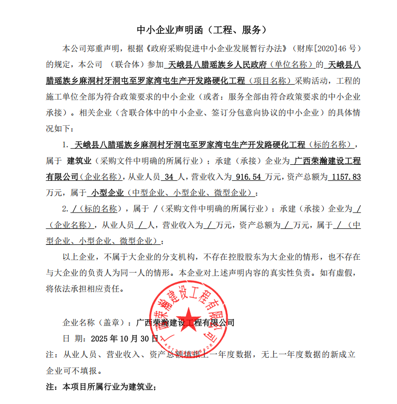 | 1 | 天峨县八腊瑶族乡麻洞村牙洞屯至罗家湾屯生产开发路硬化工程 | 天峨县八腊瑶族乡麻洞村牙洞屯至罗家湾屯生产开发路硬化工程 | 线路全长2.336704km,路基宽度:4.5米,路面宽度:3.5米,沿线路基配套建设3米高毛石挡土墙,同时根据地形和排水需求设置涵洞设施,主要建设内容包含道路硬化、挡土墙及涵洞工程等。具体内容详见工程量清单及施工图纸,具体内容详见工程量清单及施工图纸。 | 120日历天 | 农凤秋 | 桂******8281 |